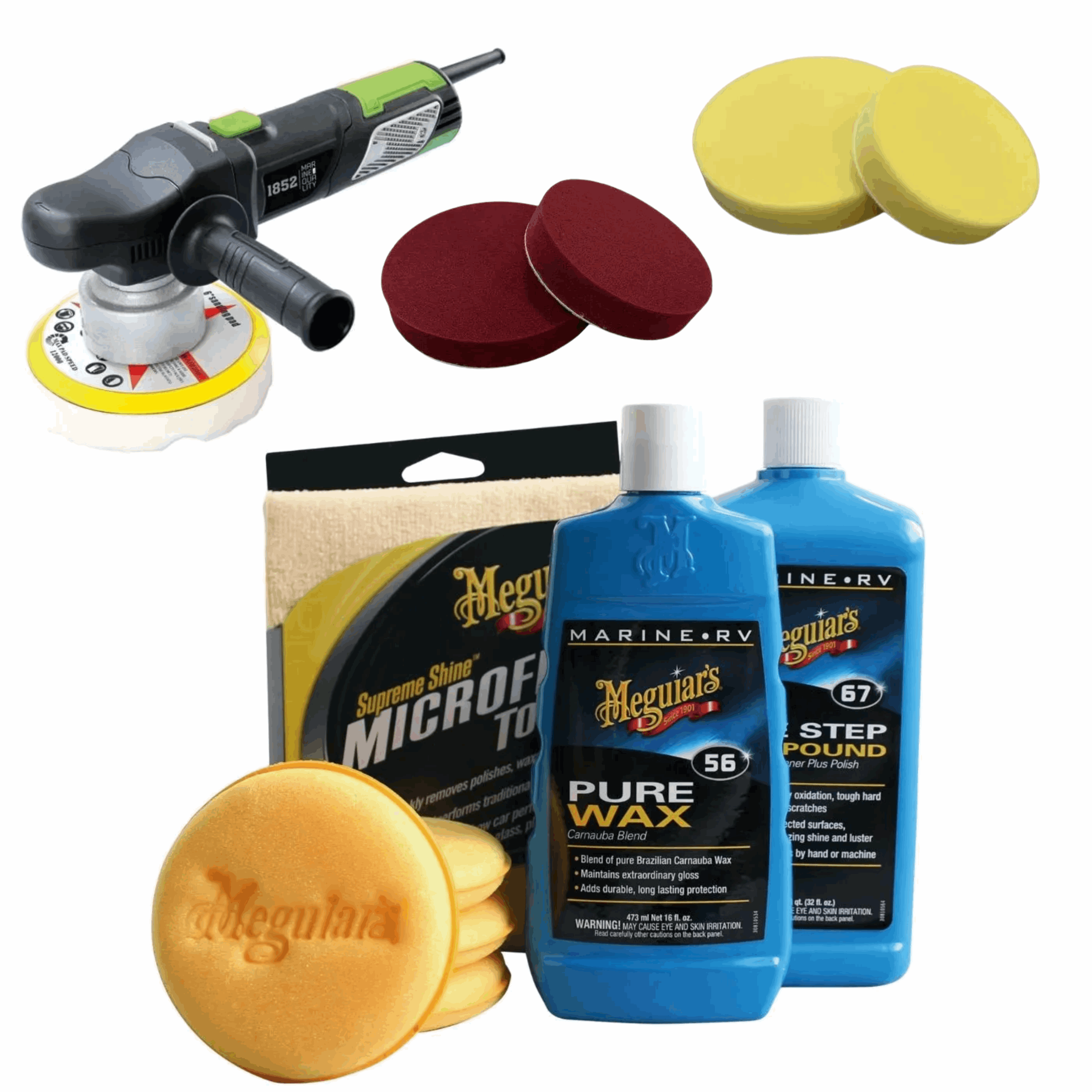 Komplett båtpleiepakke til båtpussen! Meguiars Båtpleiepakke inneholder alt du trenger for å få en skinnende blank båt. Både poleringsmaskin, voks, rens, pads og kluter i én pakke.