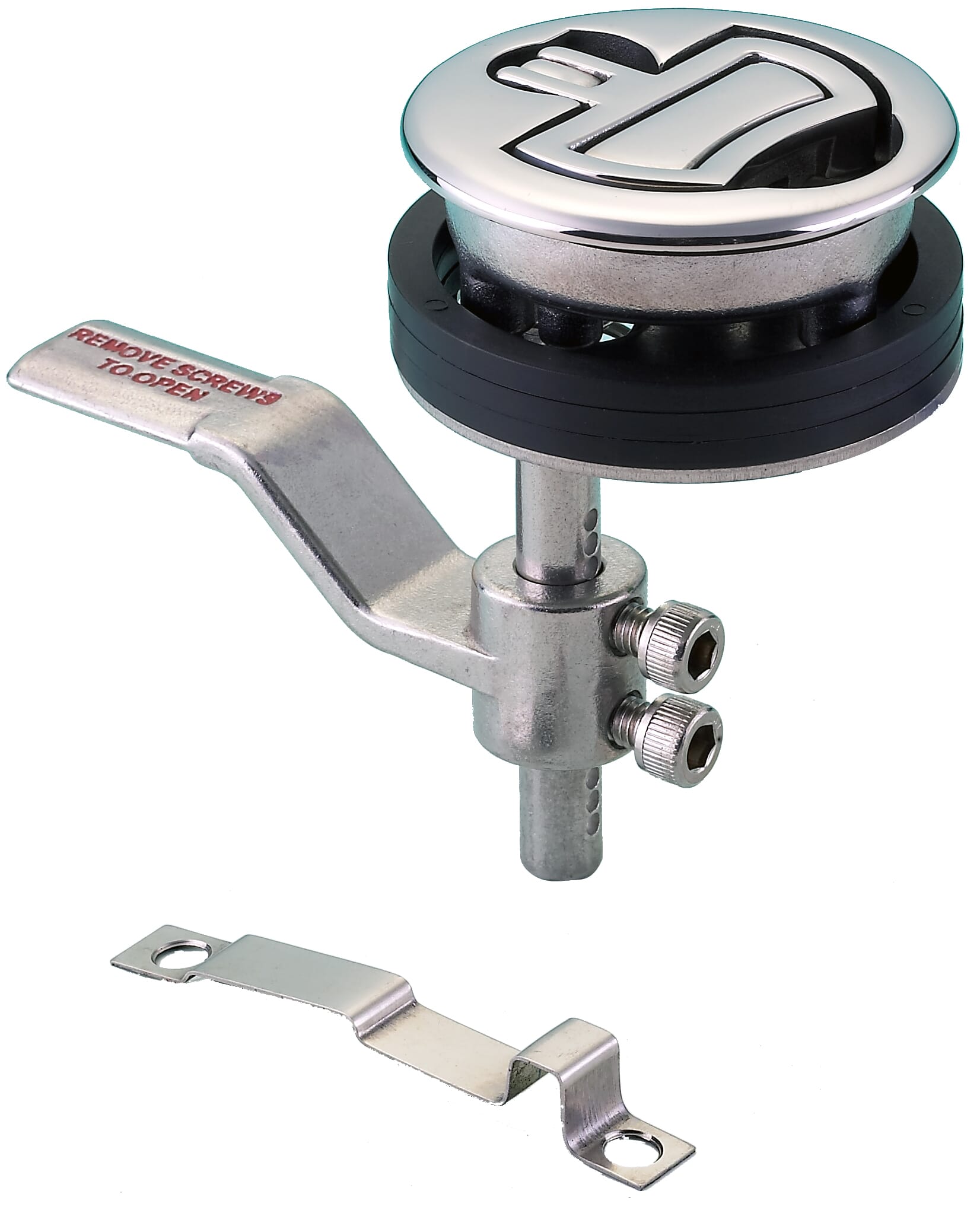 Kraftig, fjærbelastet lukelås i syrefast stål. Låsen har kompresjon, som presser luken igjen, og forhindrer slingring og dødgang når luken er lukket.