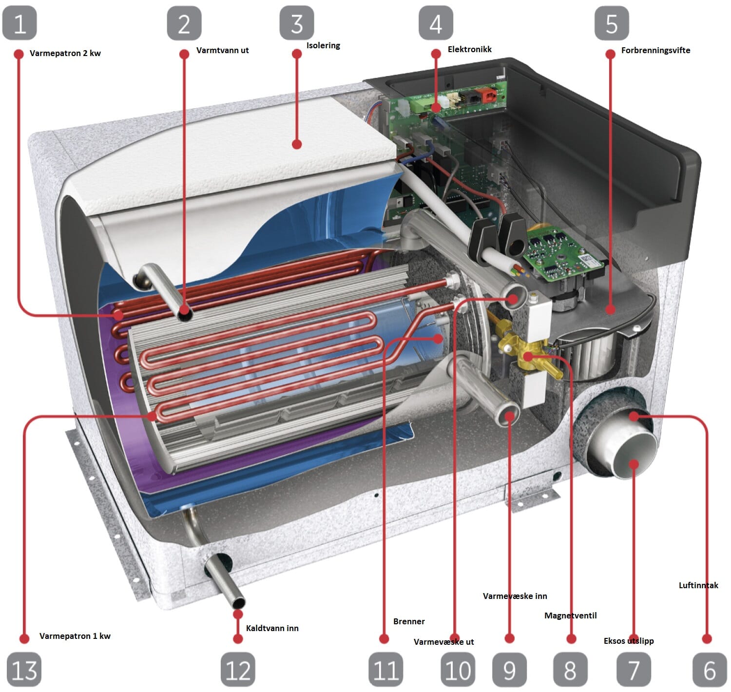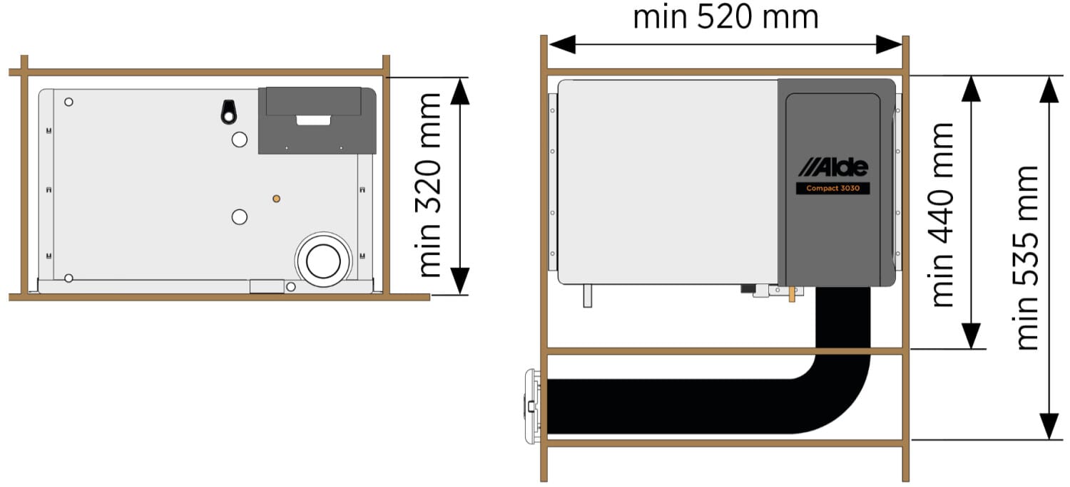 Alde Compact 3030 består av tre eksentrisk monterte rør, (varmeveksleren, vannkappen til varmesystemet og på slutten vannkappen for varmtvann). De to ytre rørene med ender og koblinger er laget av rustfritt stål, mens varmeveksleren er laget av aluminium. Varmeveksleren er delt inn i to halvsirkler. Brenneren plasseres i øvre halvdel som danner brennkammeret og i nedre halvdel ledes røykgasser ut. Brennerhuset er montert på enden av varmeveksleren. Denne består av forbrenningsvifte, brenner, magnetventil og innsug/avtrekkstilkobling. To 230-volts elektriske patroner er montert i vannkappen til varmesystemet.