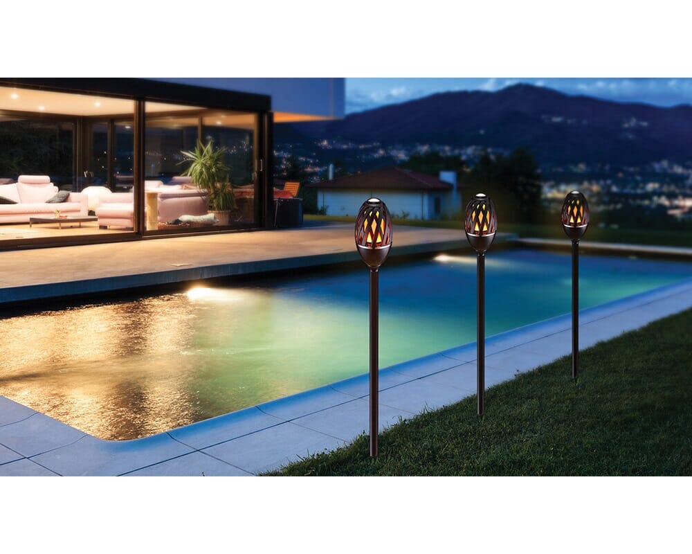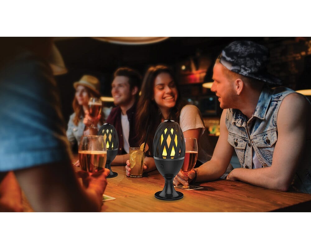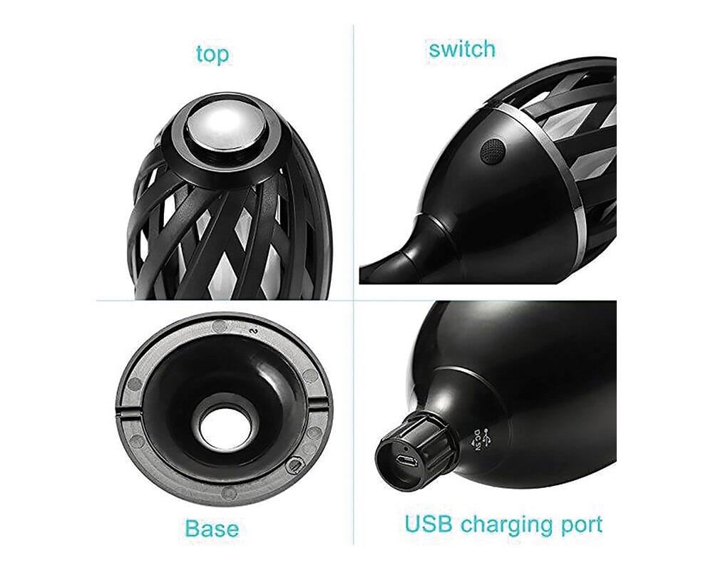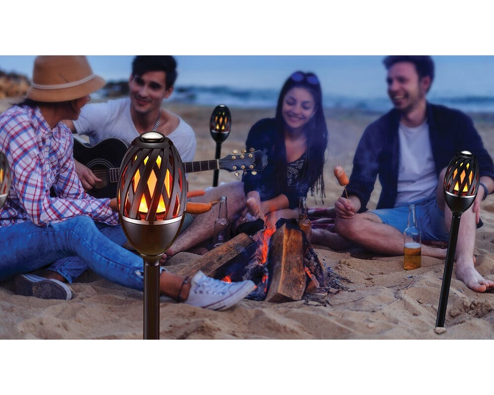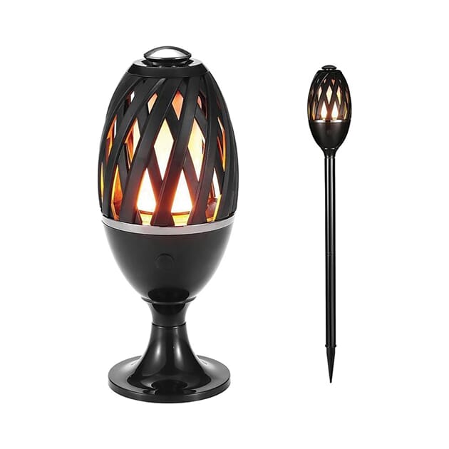 Elegant fakkelformet flammelampe med realistisk og flott flammeeffekt. Kan benyttes ute i forteltet, i hagen, på verandaen eller innendørs. Laget i robust ABS-matriale. Vanntett IP65. Leveres med oppladbart batteri som gir inntil 20 timer brukstid. Fakkelstativ og bordfot medfølger. Lades med 5V micro USB.