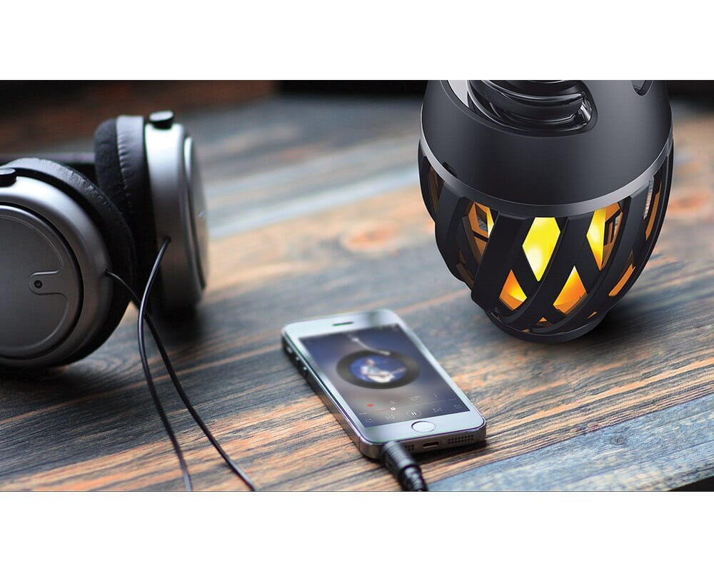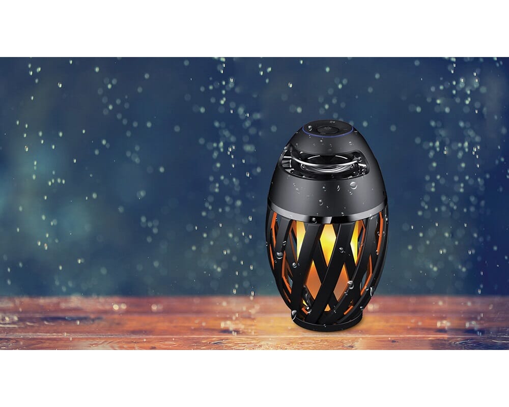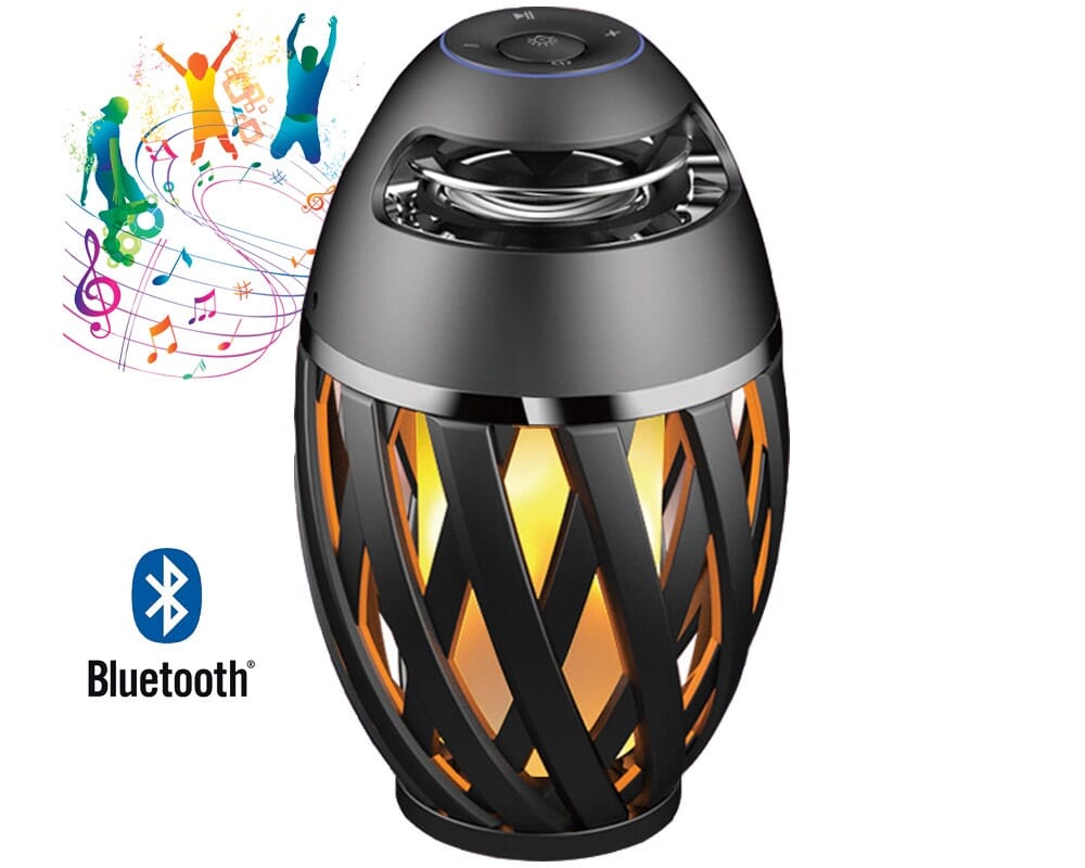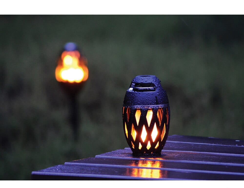 Elegant fakkelformet flammelampe med realistisk og flott flammeeffekt. Innebygget blåtann/bluetooth høyttaler på 5 watt for strømming av musikk. Kan benyttes ute i forteltet, i hagen, på verandaen eller innendørs. Laget i robust ABS-matriale. Vanntett IP65. Lades med 5V micro USB.