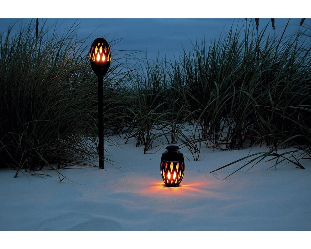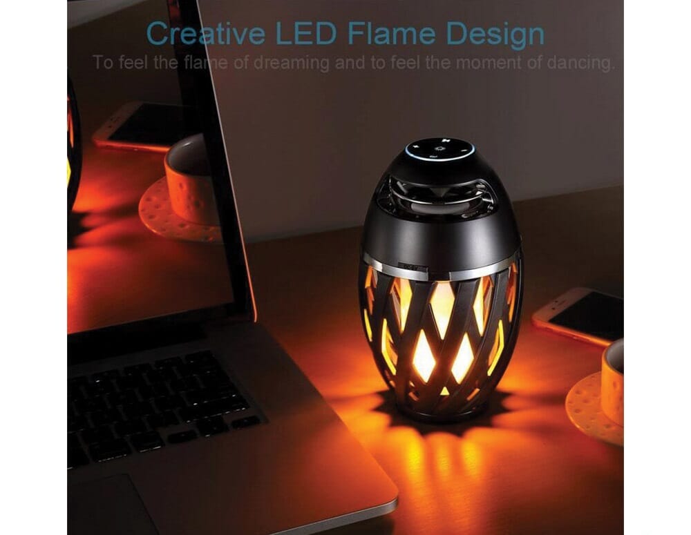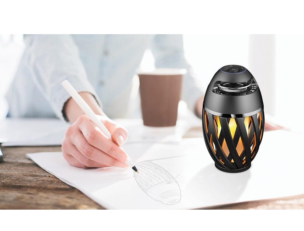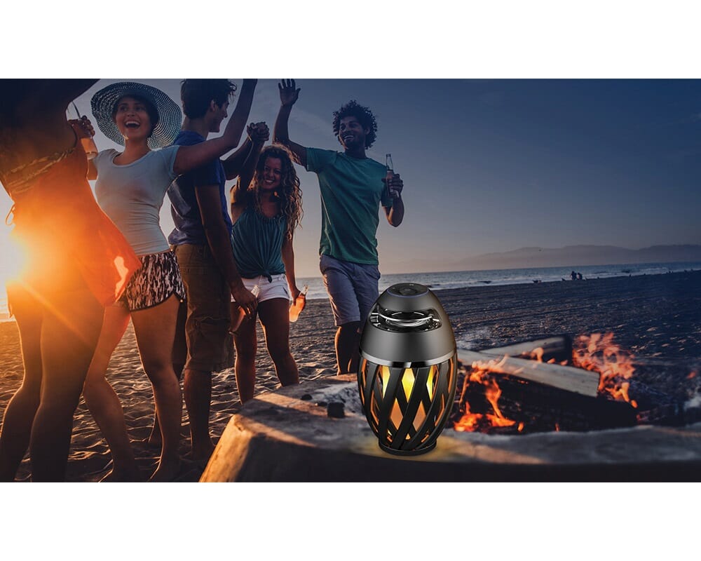 Elegant fakkelformet flammelampe med realistisk og flott flammeeffekt. Innebygget blåtann/bluetooth høyttaler på 5 watt for strømming av musikk. Kan benyttes ute i forteltet, i hagen, på verandaen eller innendørs. Laget i robust ABS-matriale. Vanntett IP65. Lades med 5V micro USB.