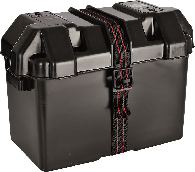 Batterikasse av slagfast polyethylene. Leveres komplett med stropp og beslag for feste til dørken.