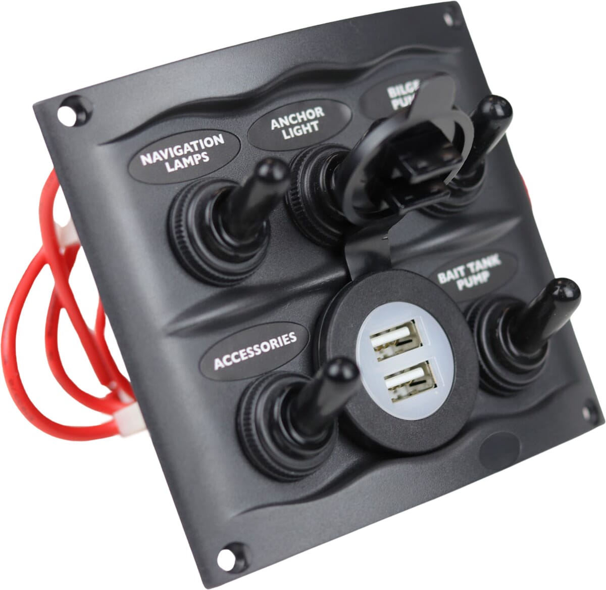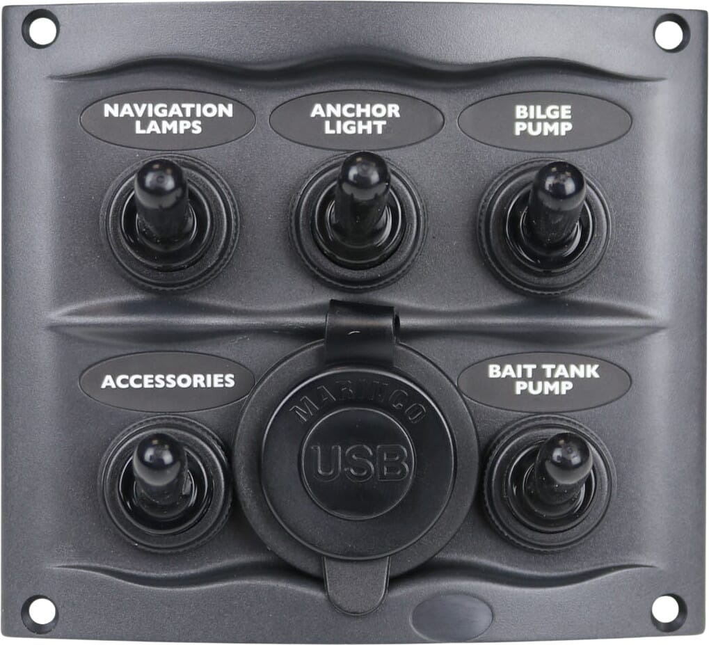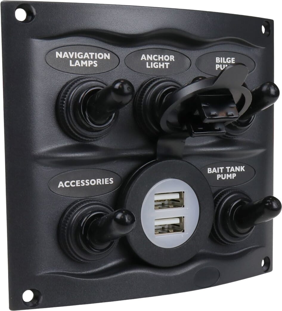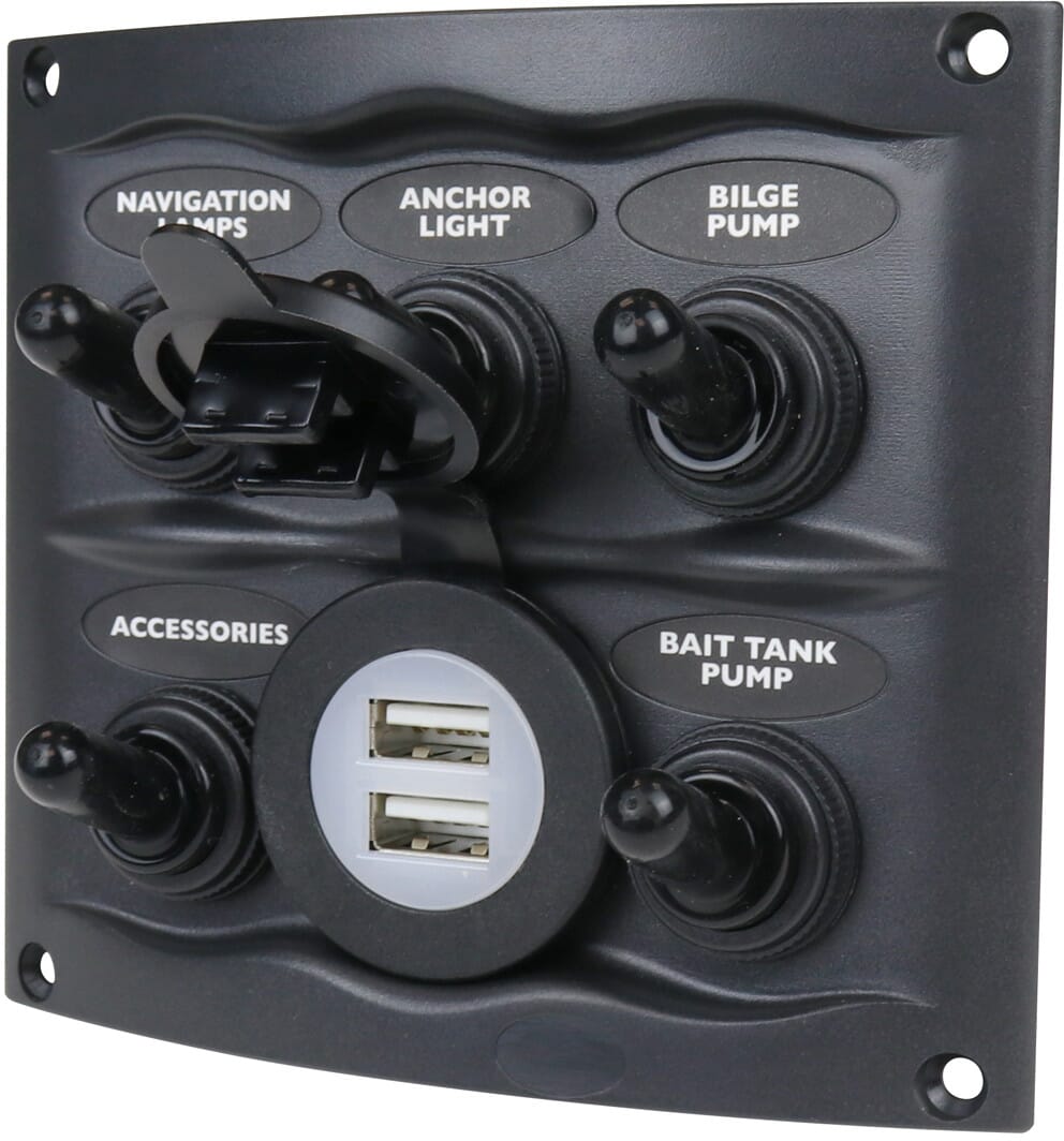 Kompakt, sprutsikkert bryterpanel med 5 brytere og dobbelt USB-uttak. Bryterpanelet er laget for innfelling. Det leveres med 3 stykk sikringsholdere med 15 A ATC sikringer.