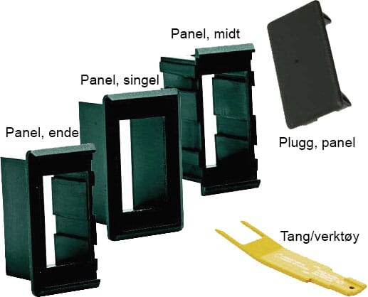 Panel til Superswitch er et enkelt byggesystem for å montere bryterne. Panelene skyves i hverandre.Egen metall tang kan kjøpes for enklere å ta bryterne ut av panelet.Utskjæring panel: 27x50 mm