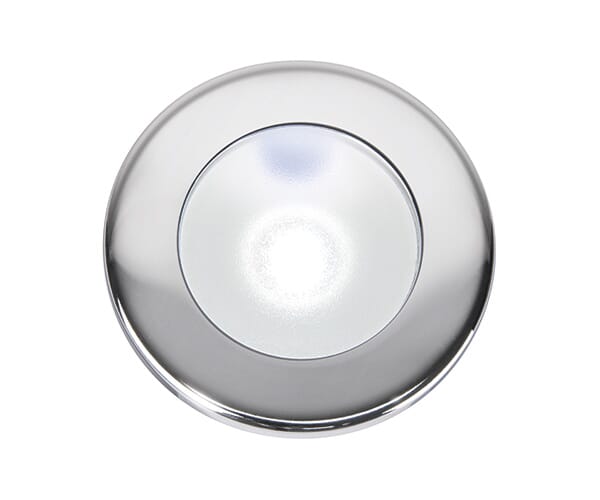 Downlight med sirkulær ramme, laget av 316 AISI rustfritt stål med satinisert anti-sjokk materiale diffuser, ideell for tak- og veggmontering.