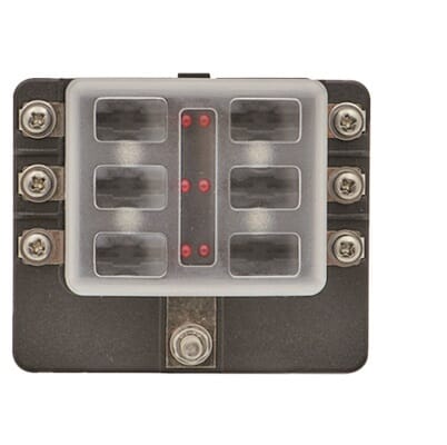 Sikringsholder med 6 uttak og LED indikatorer.- Input: M5 Studs(100A 32V DC.max)- Input wire størrelse: #4-6 AWG- 30A max. per circuit- Rødt LED lys når sikring er røket