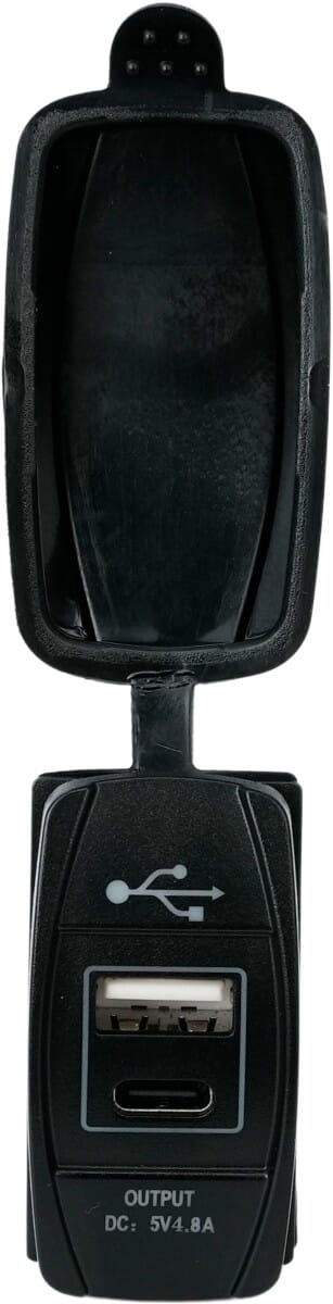 Praktisk USB ladeuttak, som passer i SuperSwitch-systemet. Det har både USB-A og USB-C-uttak, og kan dermed brukes med de aller fleste vanlige ladekabler.