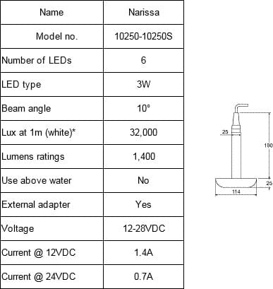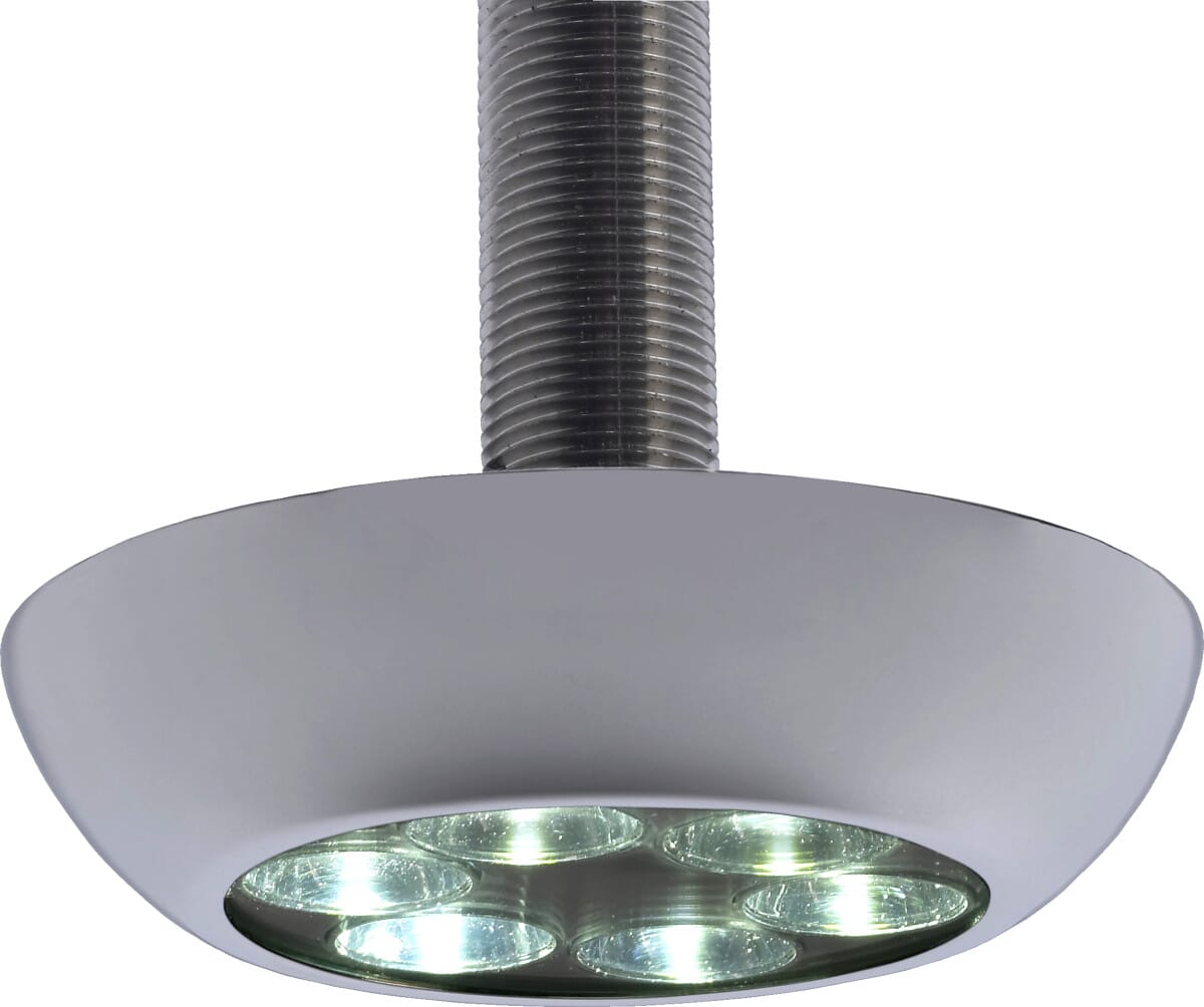 Kraftig LED undervannslys i polert, syrefast stål. 6x5 W LED sørger for et kraftig, konsentrert lys. Undervannslyset er solid forseglet for å hindre lekkasje. Lyset skal kun brukes under vann siden det trenger kjøling. Forbruket er på under 1 A. 12-28V. Dette undervannslyset er meget enkelt å montere siden det kun kreves å bore et lite hull i skroget på 1" (25 mm).