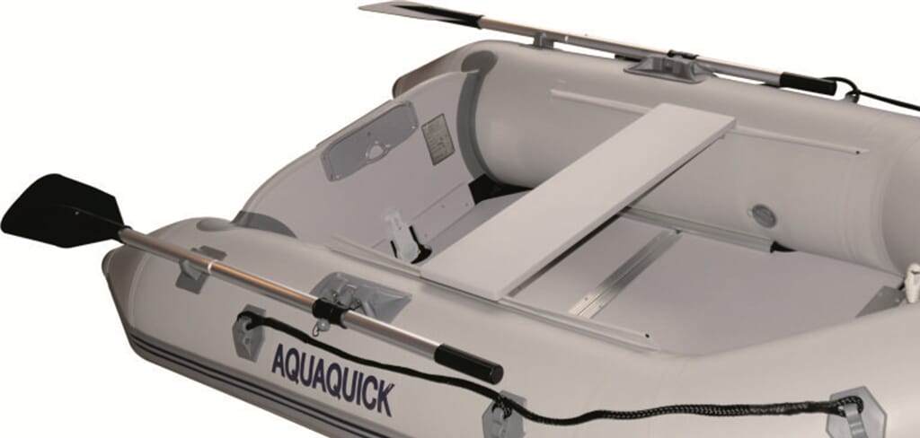 Gummibåt Aquaquick MS er robust og praktisk med fast tredørk av vannfast kryssfinér. Leveres med V-bunn og oppblåsbar kjøl.