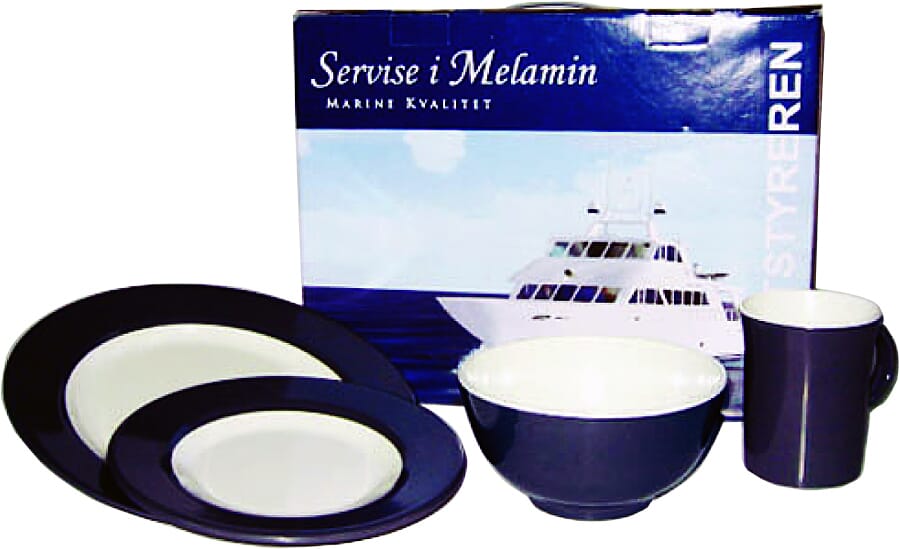 Servise i melamin pakket i gaveboks. Serviset er meget solid og i maritim utførelse. Startpakke for 4 personer. Består av 16 deler: 4 x middagstallerken4 x frokosttallerken4 x skål/bolle4 x kaffekrus