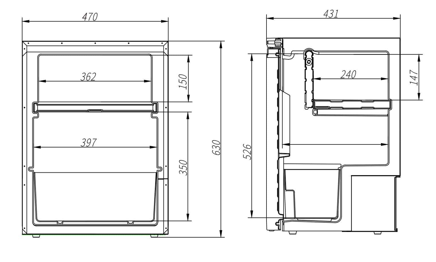 - Innvendig mål frys (L x B x H): 362 x 240 x 147 mm