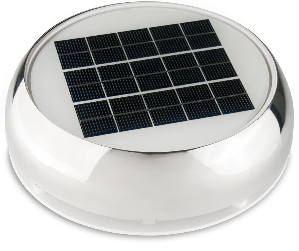 Solcelleventilator i meget høy kvalitet. Utstyrt med solcellepanel og vifte. Ved hjelp av innebygde, oppladbare batterier kan denne gi luftsirkulasjon 24 timer i døgnet. Fulladede NiMh-batterier kan drive ventilatoren hele 40 timer uten sollys. Jevn sirkulasjon av luft i båten bidrar til å eliminere kondens og muggproblemer. Rotasjonsretningen kan snus slik at ventilatoren også kan suge/trekke inn luft. Solcelleventilatoren kan slås av og den er meget støysvak i bruk.