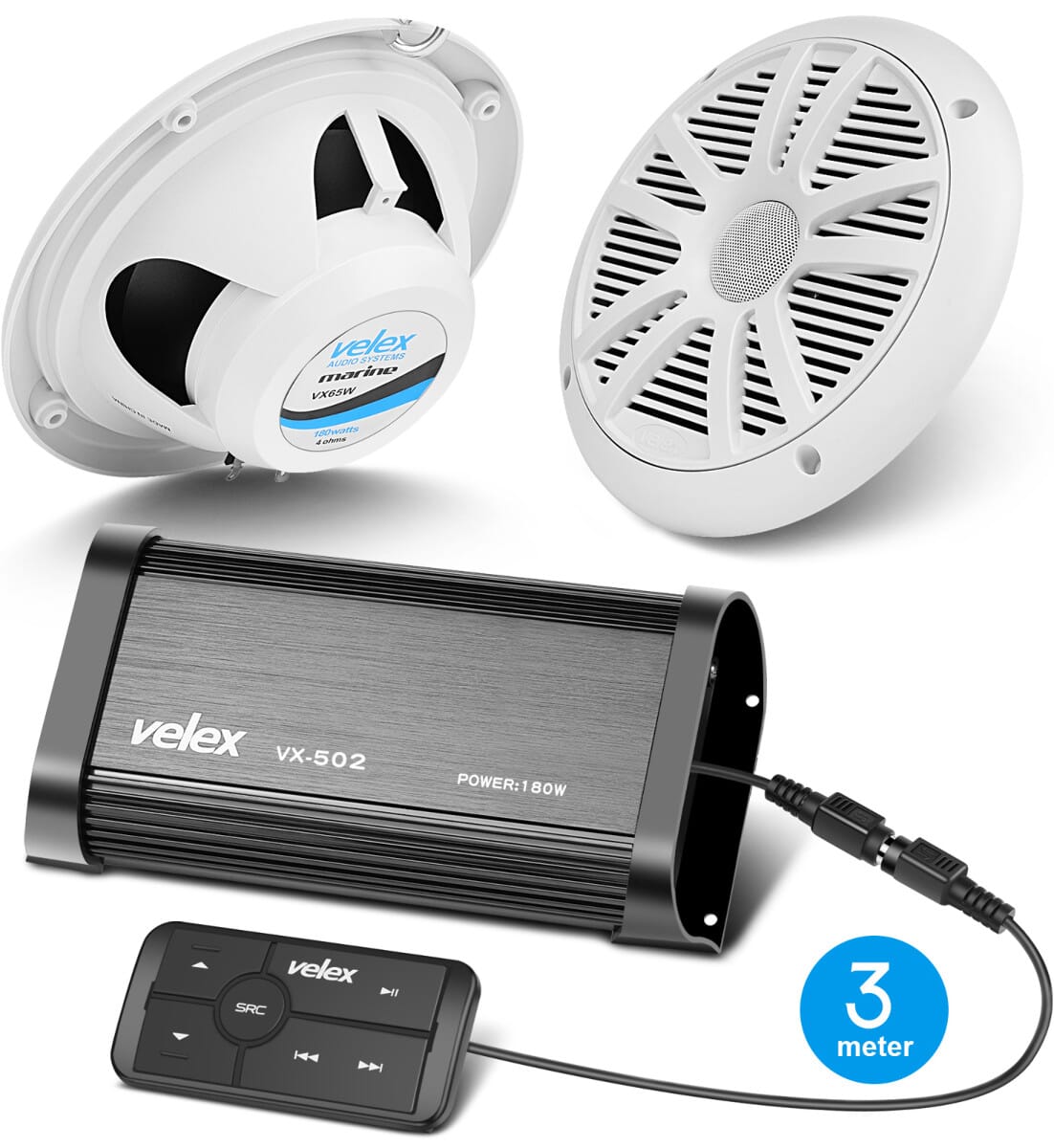 Et perfekt musikkanlegg for fritidsbåter fra VELEX. To stk hvite marinehøyttalere på 6,5" medfølger. Class A/B forsterker med 180W max output.