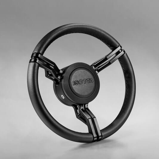 Diameter: 350mm - 13.80”Grep: Sort skinnEiker: Doble paralelle eiker i sort aluminiumSenterflens: Sort aluminiumSenterkopp: Sort skinn uten Isotta logoHub med kilespor