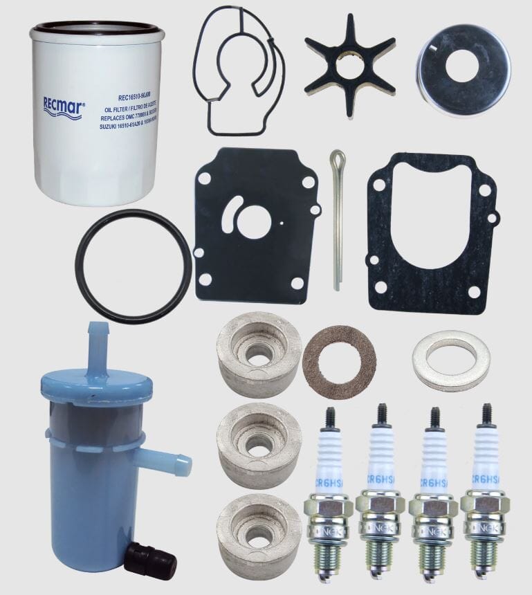 1 - Vannpumpe reparasjonssett1 - Propell splint1 - Motoroljefilter3 - DCPR6E tennplugger1 - Motorolje tappe pakning2 - Undervannshus tappepluggpakninger3 - anoder2 - anodedeksel O-ring1 - Drivstofffilter