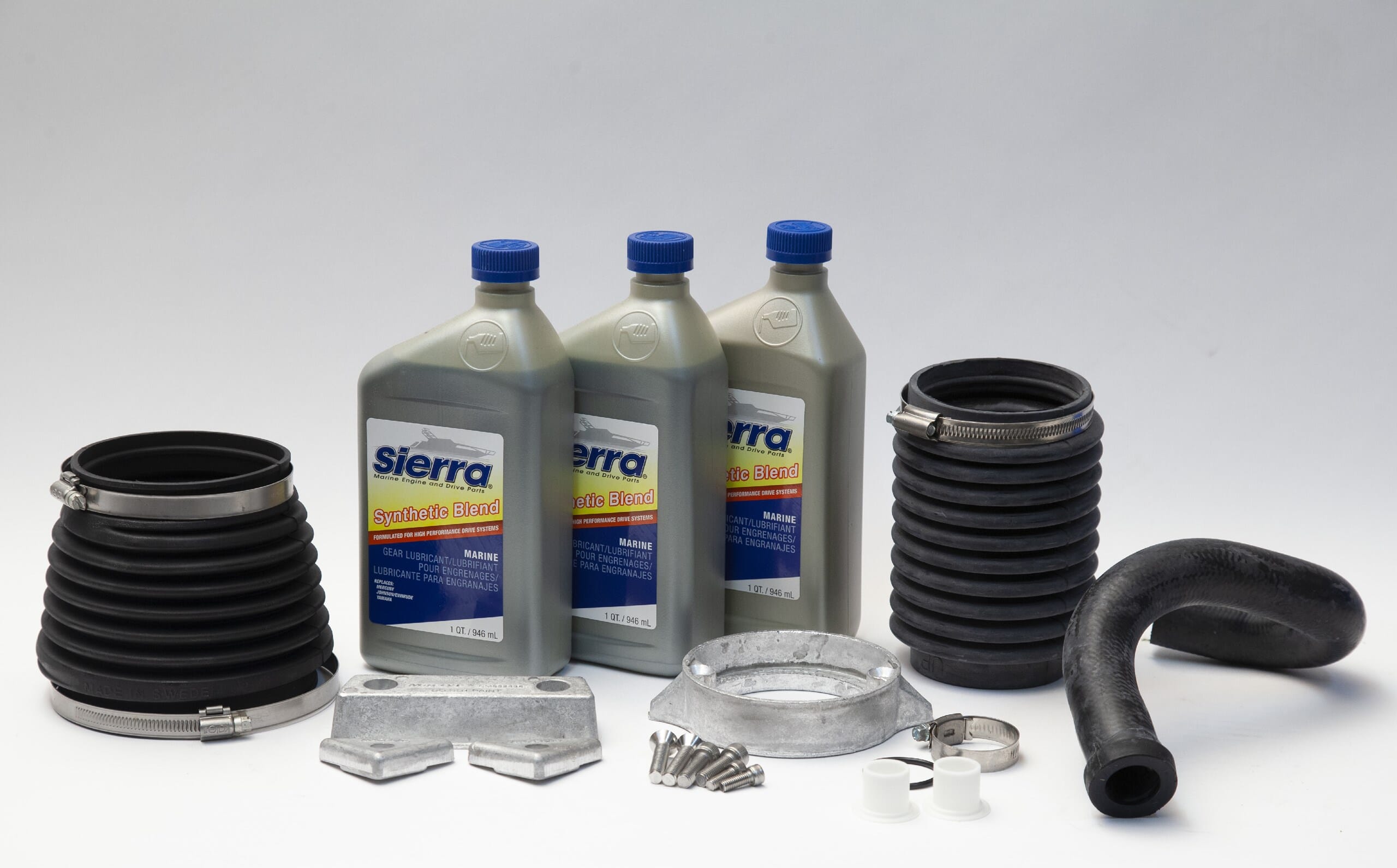 Stor servicepakke med alle belger, vannslange, vanninntak, girolje og anodesett. Til komplett service av drevet.
