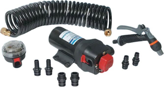 Komplett spylesett med pumpe, slange, spylemunnstykke, vannfilter og koblinger. 7 meter spiralslange med hurtigkoblinger, og et godt spylemunnstykke, gjør dette til et praktisk og brukervennlig sett til vask og spyling av båt og utstyr.