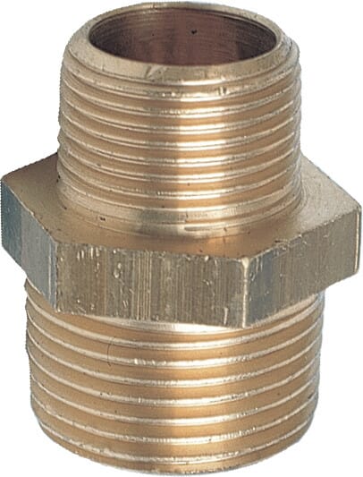 Reduksjonsnippel "han/han" med utvendige rørgjenger. Laget i messing. ISO 7/1 (BS 21) og ISO 228/1 (BS 2779).