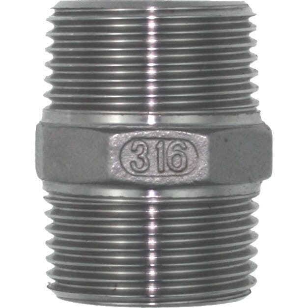 Ansatsnippel "han/han" med utvendige rørgjenger. Laget i syrefast stål 316.