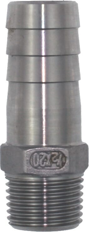 Slangekopling "han" med utvendige rørgjenger og slangekopling. Laget i syrefast stål 316.