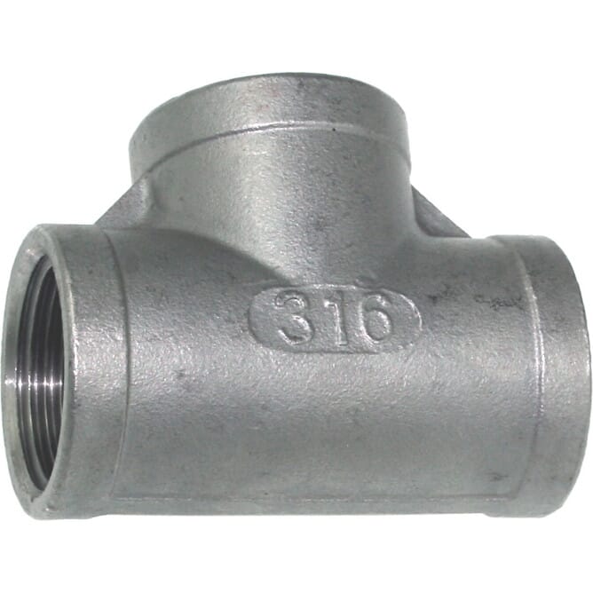 T-stykke "hun/hun/hun" med innvendige rørgjenger. Laget i syrefast stål 316.