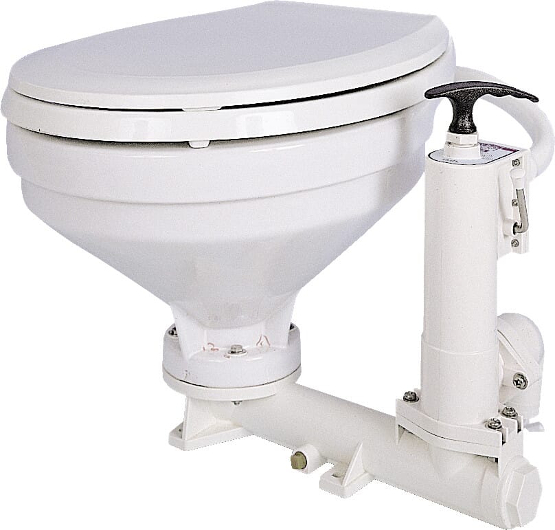 Toalett med porselensbolle og sete/lokk i plast. Pumpen er dobbeltvirkende (pumper både når man trekker og skyver på håndtaket). Slangedim. inntak: 19 mm (3/4")Slangedim. uttak: 38 mm (1 1/2")