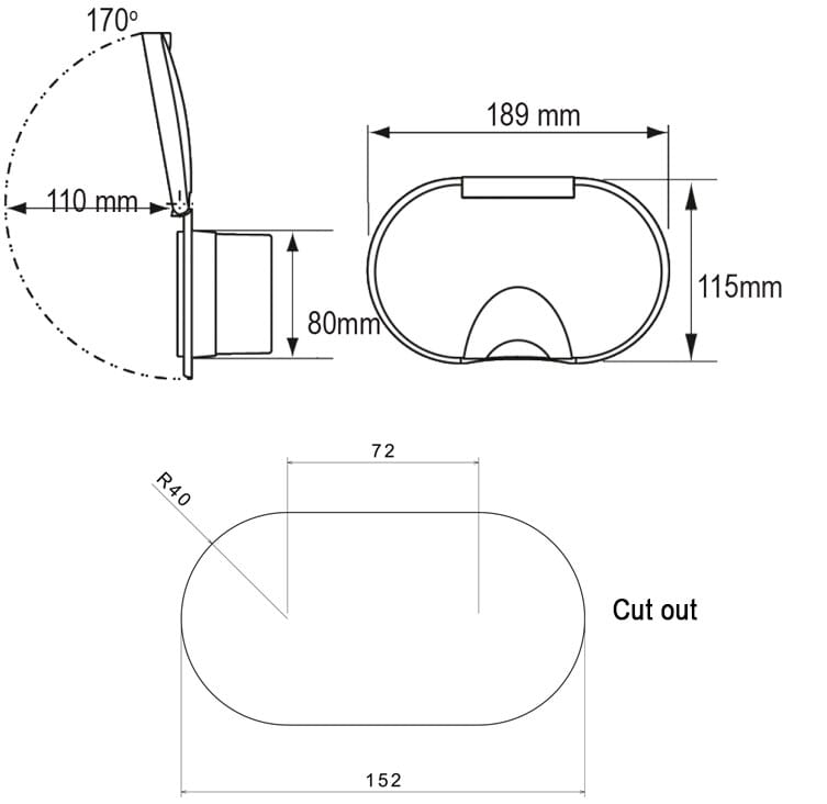 - Utskæringsmål: 152 x 80 mm (runde ender)