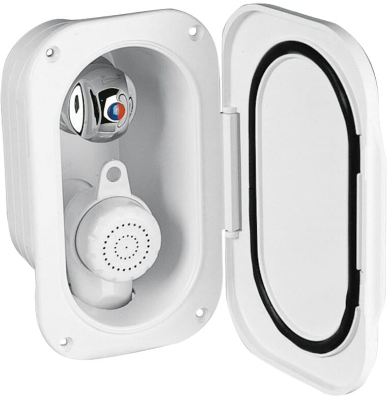 Komplett dusjboks med lokk med tett pakning. Dusjboksen har integrert blandebatteri, og dusjhode med 3 meter lang slange. Den egner seg svært godt til montering på badeplattformen.